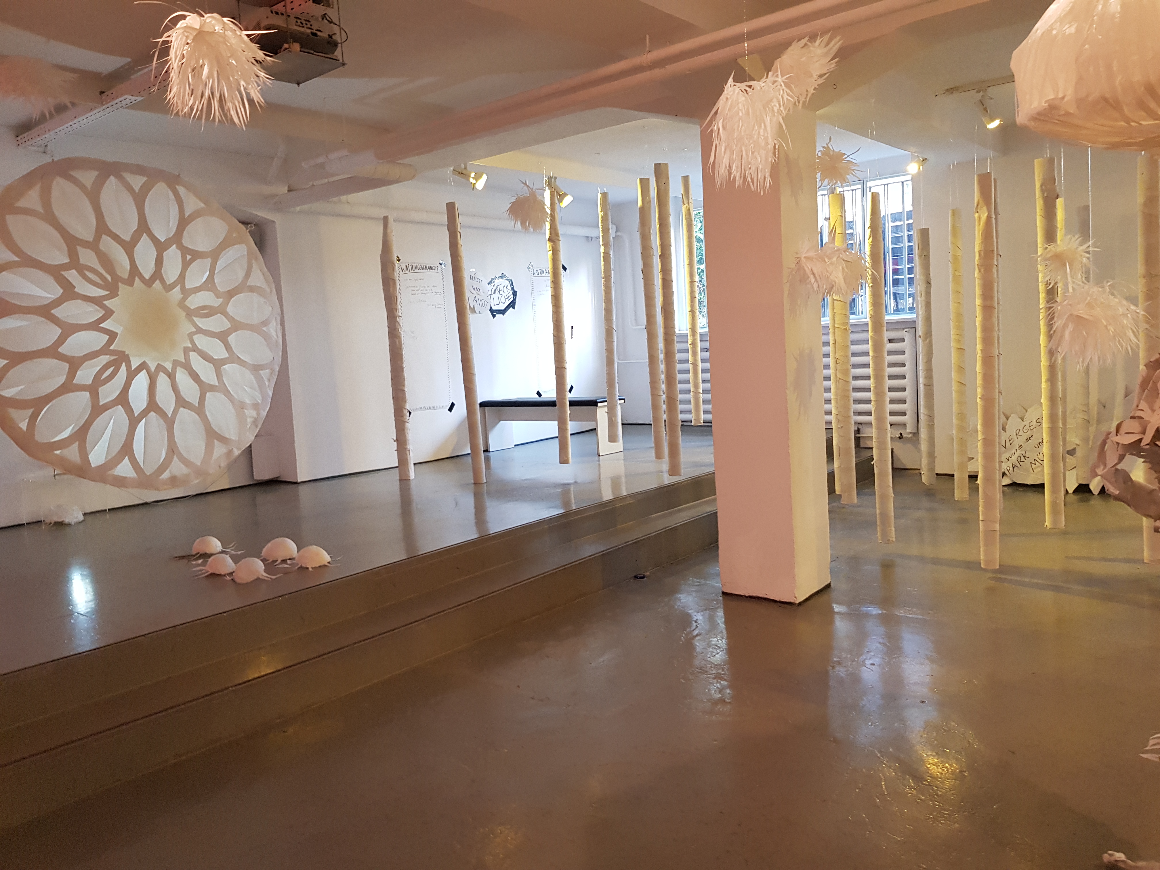 Papierskulpturen, Formen, Hängungen und Gestalten transformieren einen Raum in eine weiße Waldwelt. Sie locken tief in die sonst verborgenen Schichten eines vergessenen Ortes, der sich verändert, und dich verändert.